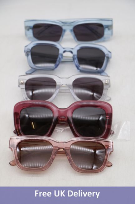 Five Ace & Tate Sunglasses, 1x Bridgette Red Velvet, 1x Allen Blush, 1x Lukas Sky Blue Bio, Allen Crystal and 1x Andy Sky Blue Bio, No Cases