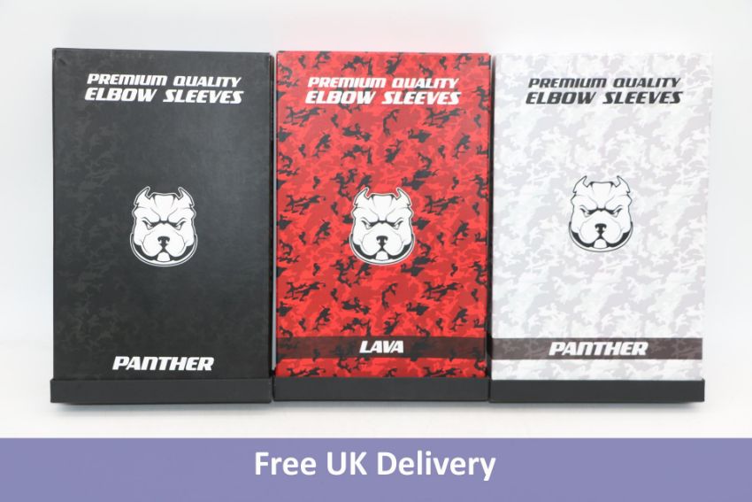 Three Pairs of Gym Bullies Elbow Sleeves, Large, 1x White/Grey Panther, 1x Black Panther and 1x Red Lava