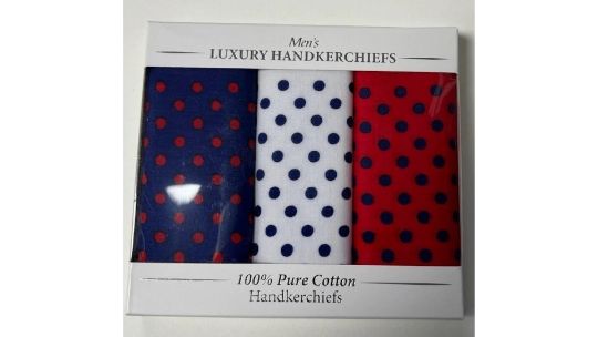 Ten Packs of Le Chateau Men's Supersize Handkerchiefs, Red White & Blue Polka Dot, 3 Per Pack