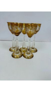 Five Bohemian Amber Flashed and Vine Cut Wine Glasses