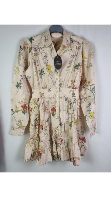ByTimo Poplin Mini Dress Botanical, Beige, Long Sleeve, Collard, Medium